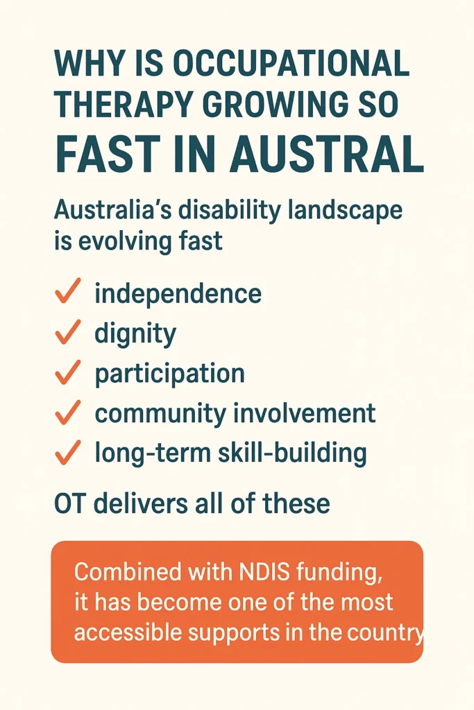 In Australia, OT plays a major role within NDIS, disability support, aged care, mental health, and paediatric development. Families rely heavily on occupational therapists because they provide both emotional support and practical solutions that actually work.